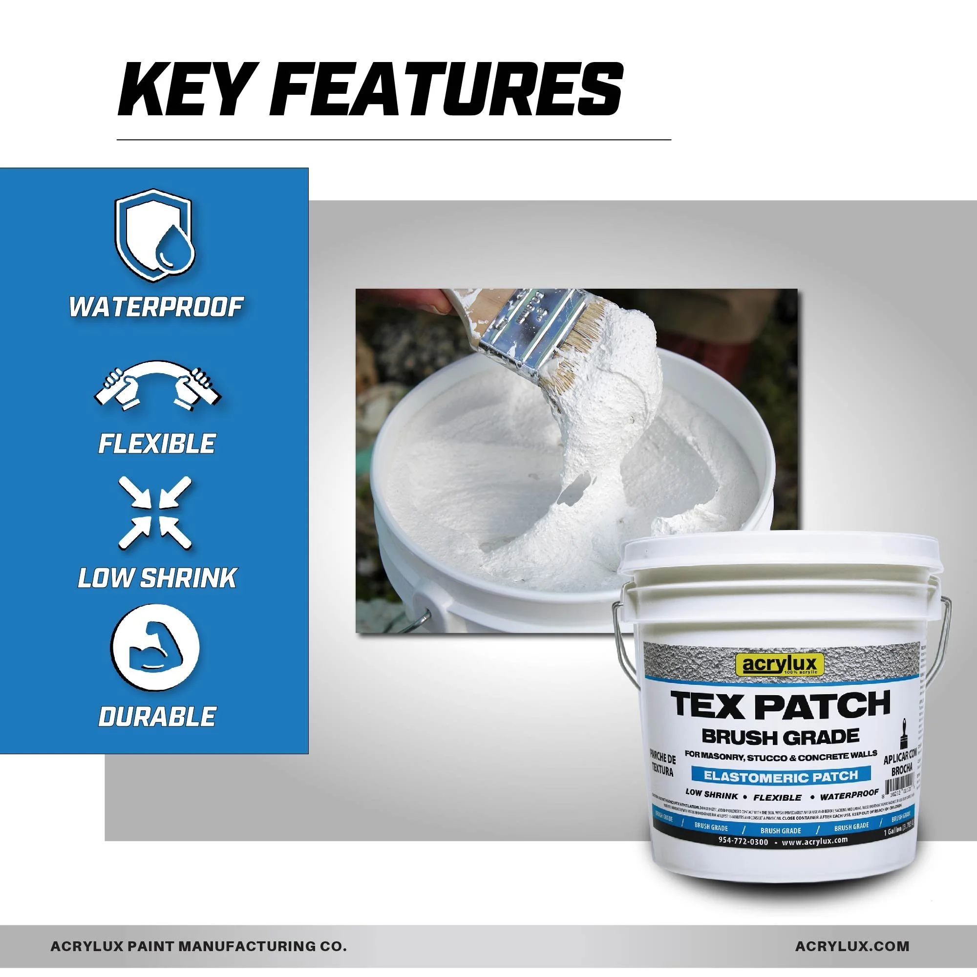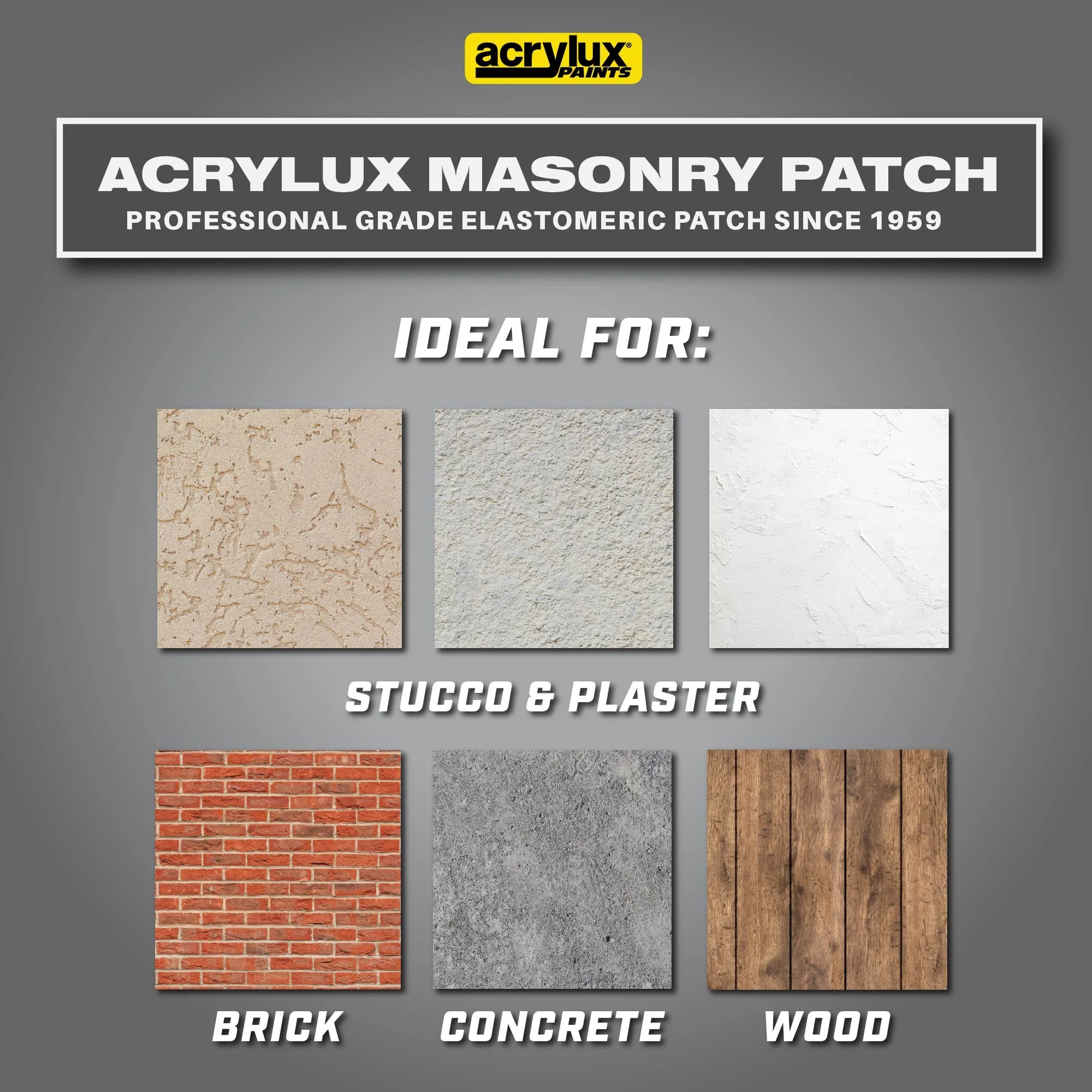 Acrylux Brush Grade Masonry Patch produces professional grade results when fixing imperfections in masonry, stucco, and concrete surfaces. This product can easily be applied with a chip brush when feathering edges or faced with hairline cracks and small holes.